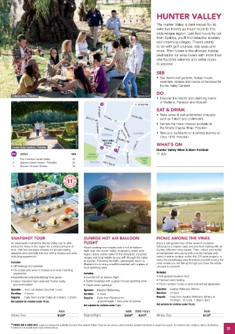 • Return transfers from selected Hunter Valley • Buffet breakfast with a glass of local sparkling wine • Premium wine tasting