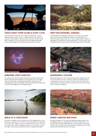 sites is off-limits from the ground. Marvel as the sunlight changes the challenging 223 kilometres of the Larapinta Trail. Cool off with a fresh dip in