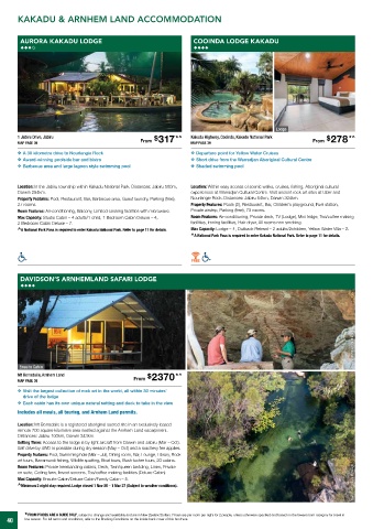 ^A National Park Pass is required to enter Kakadu National Park. Refer to page 11 for details. Max Capacity: Lodge – 4, Outback Retreat – 2 adults/2children, Yellow Water Villa – 2.