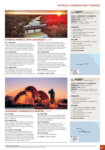 welcome dinner at the Woolshed Restaurant. Stay the Longreach Sound & Light Show, which brings the • Savannah Guide Driver