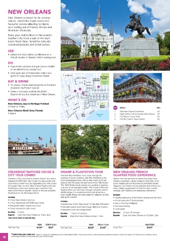 • 2 hour Steamboat NATCHEZ jazz cruise • Guided tour of the “Big House” at Oak Alley Plantation • Visit to The French Market