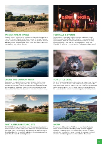 offer, with trails and hikes to suit all fitness levels and interests. The most Highlights include Hobart’s Dark Mofo during the winter solstice with its