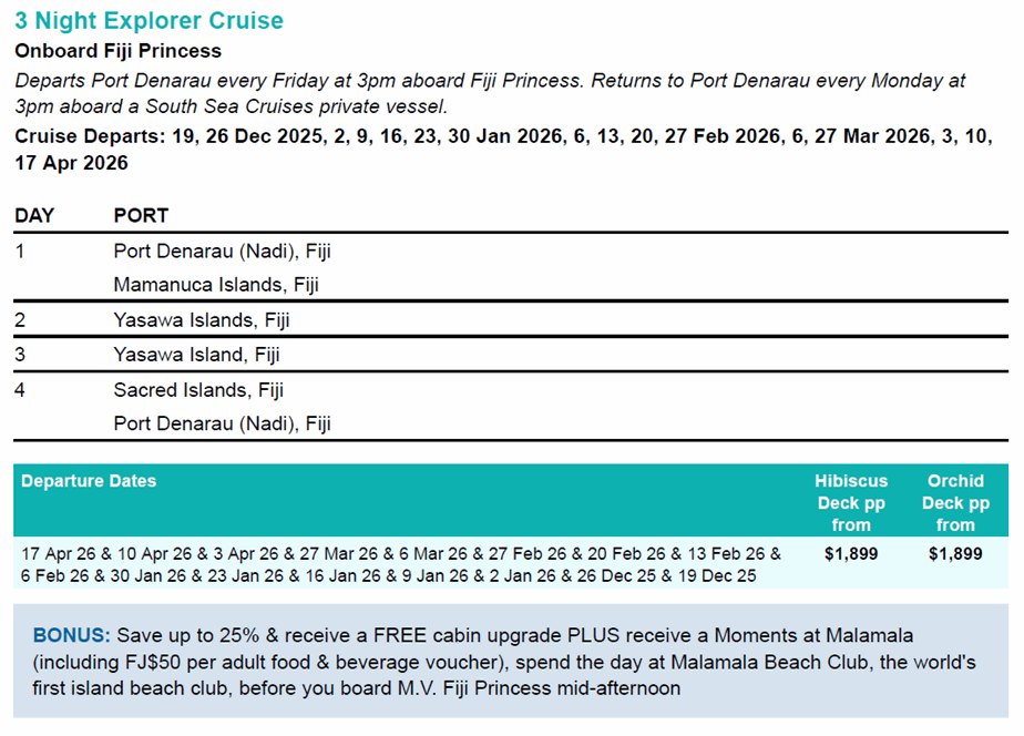 PACKAGE TERMS & CONDITIONS: It is our policy to present the cost of our holidays inclusive of all airport and government charges. Please accept however that these charges are not within our control, therefore we reserve the right to pass on any increase. Travel agent professional service fees where charged, will be additional to the advertised prices. Closeout and blackout periods apply over school holidays and peak holiday periods & availability of seats & rooms is likely to be very limited over this time . Valid for sales to 15 Jan 2026. Valid for travel commenced and completed within the period 19 Dec 2025 to 20 Apr 2026 (unless otherwise specified).A 25% deposit is required at the time of booking upon which time you are accepting our terms and conditions for this unique offer. The final balance is due at least 60 days prior to your cruise departure. 4 Night guests may use their day pass on a day either pre or post their cruise, but this option is not available on the day of cruise departure). Subject to availability at Malamala Beach Club. 3 and 7-night itineraries, will see you check-in your luggage at Port Denarau Marina before transferring to Malamala Beach Club on day of cruise. Mid-afternoon a tender boat will transfer you to M.V. Fiji Princess where your luggage will be waiting in your cabin. Prices shown are based on per person costs in New Zealand Dollars, for payment by cash, cheque or eftpos only. Credit card sales not permitted unless Travel Agent acts as a merchant. Capacity limitations apply and may not be available on all services. Events beyond our control such as currency fluctuations and changes to the price of aviation fuel may result in prices variations . Strict cancellation fees apply. For full terms and conditions and cancellation fees please contact your local travel agent for more information. Prices are subject to change at any time without notice. Trade enquiries via GO Holidays. ISSUE DATE:03 Nov 25.
