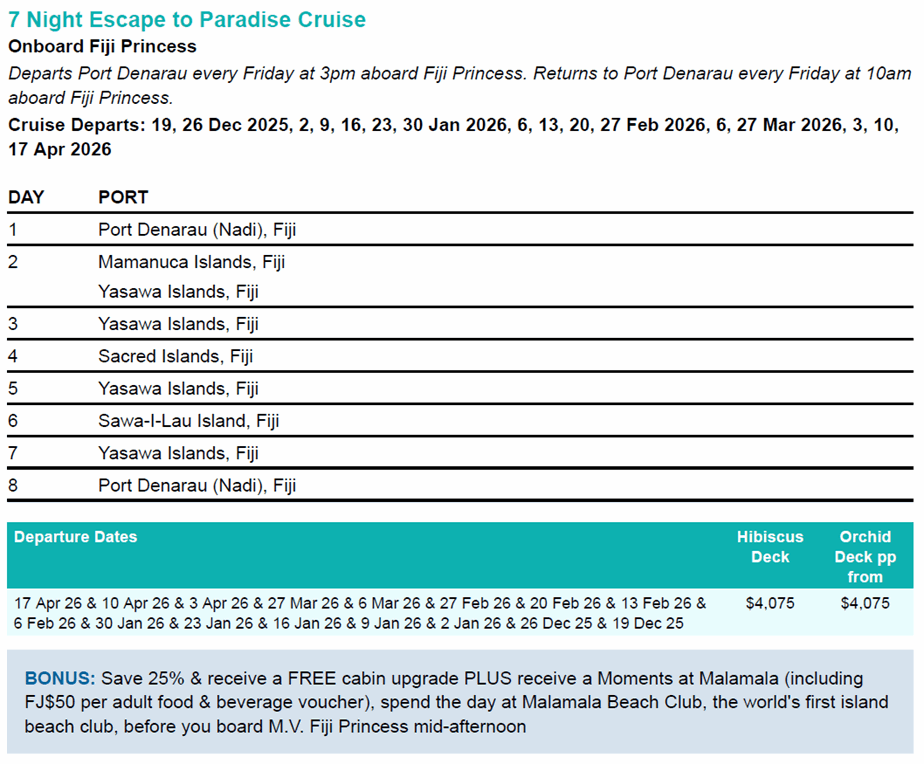 PACKAGE TERMS & CONDITIONS: It is our policy to present the cost of our holidays inclusive of all airport and government charges. Please accept however that these charges are not within our control, therefore we reserve the right to pass on any increase. Travel agent professional service fees where charged, will be additional to the advertised prices. Closeout and blackout periods apply over school holidays and peak holiday periods & availability of seats & rooms is likely to be very limited over this time . Valid for sales to 15 Jan 2026. Valid for travel commenced and completed within the period 19 Dec 2025 to 20 Apr 2026 (unless otherwise specified).A 25% deposit is required at the time of booking upon which time you are accepting our terms and conditions for this unique offer. The final balance is due at least 60 days prior to your cruise departure. 4 Night guests may use their day pass on a day either pre or post their cruise, but this option is not available on the day of cruise departure). Subject to availability at Malamala Beach Club. 3 and 7-night itineraries, will see you check-in your luggage at Port Denarau Marina before transferring to Malamala Beach Club on day of cruise. Mid-afternoon a tender boat will transfer you to M.V. Fiji Princess where your luggage will be waiting in your cabin. Prices shown are based on per person costs in New Zealand Dollars, for payment by cash, cheque or eftpos only. Credit card sales not permitted unless Travel Agent acts as a merchant. Capacity limitations apply and may not be available on all services. Events beyond our control such as currency fluctuations and changes to the price of aviation fuel may result in prices variations . Strict cancellation fees apply. For full terms and conditions and cancellation fees please contact your local travel agent for more information. Prices are subject to change at any time without notice. Trade enquiries via GO Holidays. ISSUE DATE:03 Nov 25.