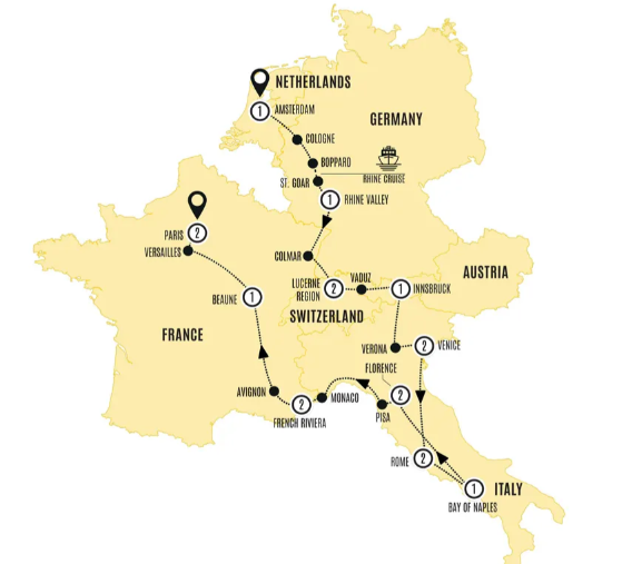 Highlights: Amsterdam, Cologne, Rhineland, Colmar, Lucerne Region, Liechtenstein, Innsbruck, Verona, Venice, Rome, Bay of Naples, Florence, Pisa, Monaco, French Riviera, Avignon, Beaune, Versailles, Paris.
