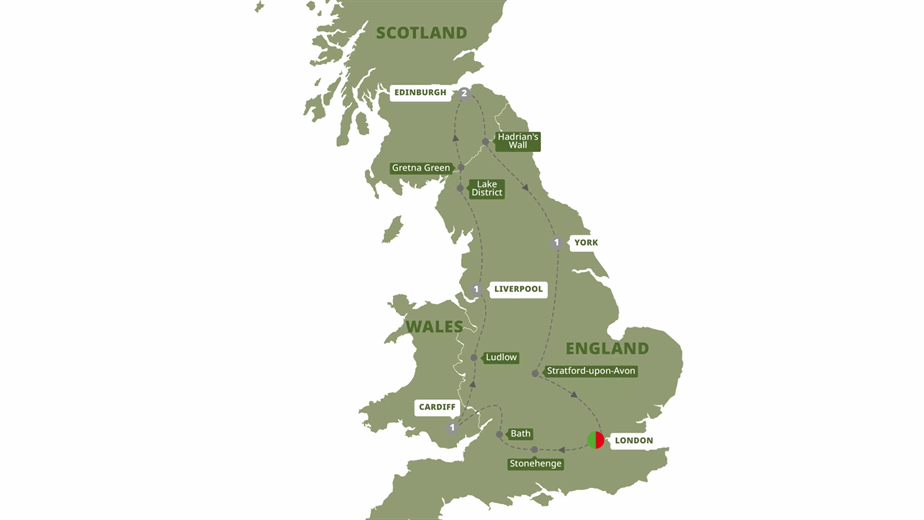 Highlights: London, Stonehenge, Bath, Cardiff, Ludlow, Liverpool, Lake District, Gretna Green, Edinburgh, Hadrian’s Wall, York, Stratford-upon-Avon.