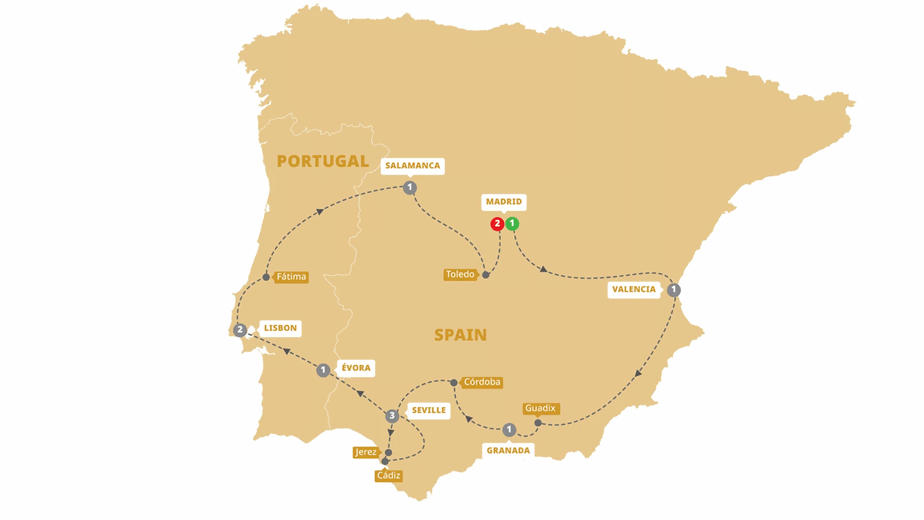 Highlights: Madrid, Valencia, Guadix, Granada, Córdoba, Seville, Jerez de la Frontera, Cádiz, Évora, Lisbon, Fátima, Salamanca, Toledo, Madrid.