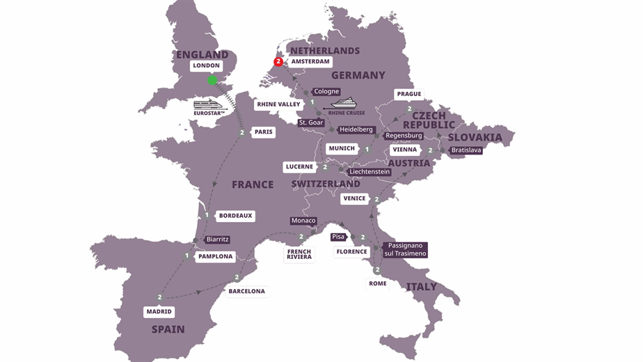 Highlights: London, Paris, Bordeaux, Biarritz, Pamplona, Madrid, Barcelona, French Riviera, Monaco City, Pisa, Florence, Rome, Vatican City, Tuscany, Venice, Vienna, Bratislava, Prague, Regensburg, Munich, Vaduz, Lucerne, Heidelberg, Sankt Goar, Koblenz, Cologne, Amsterdam.