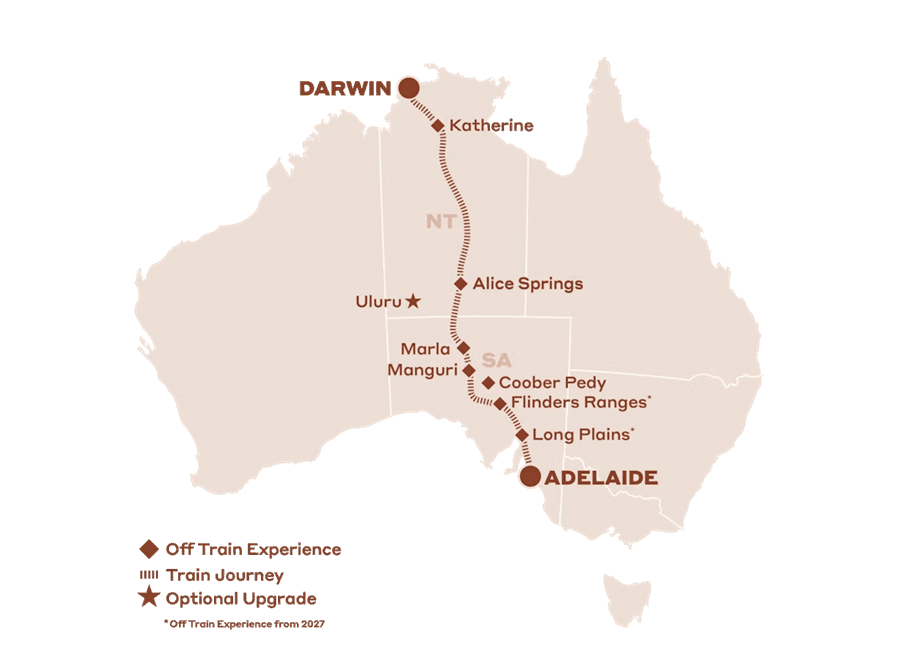 - 4 days/3 nights aboard The Ghan Expedition from Darwin to Adelaide - all meals, fine wines and beverages and Off Train Experiences in Katherine, Alice Springs, Cooper Pedy and Manguri