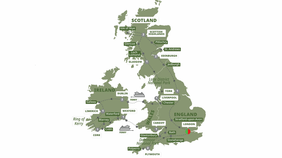 Highlights: London, Stratford-upon-Avon, York, Jedburgh, Edinburgh, St. Andrews, Pitlochry, the Scottish Highlands, Isle of Skye, Fort William, Glasgow, Lake District, Liverpool, Chester, Holyhead, Dublin, Glendalough, Galway, Limerick, Ring of Kerry, Cork, Blarney, Cobh, Waterford, Wexford, Cardiff, Bath, Glastonbury, Plymouth, Polperro, and Stonehenge.