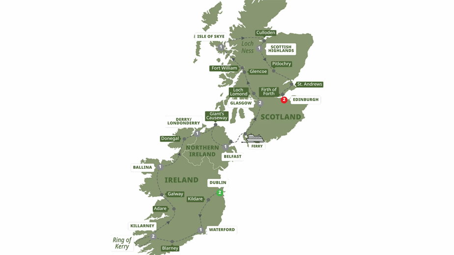 Highlights: Dublin, Kildare, Waterford, Blarney, Killarney, Ring of Kerry, Adare, Galway, ballina, Donegal, Londonderry, Giant’s Causeway, Belfast, Glasgow, Glencoe, Fort William, Isle of Skye, Culloden, Scottish Highlands, St. Andrews, Edinburgh