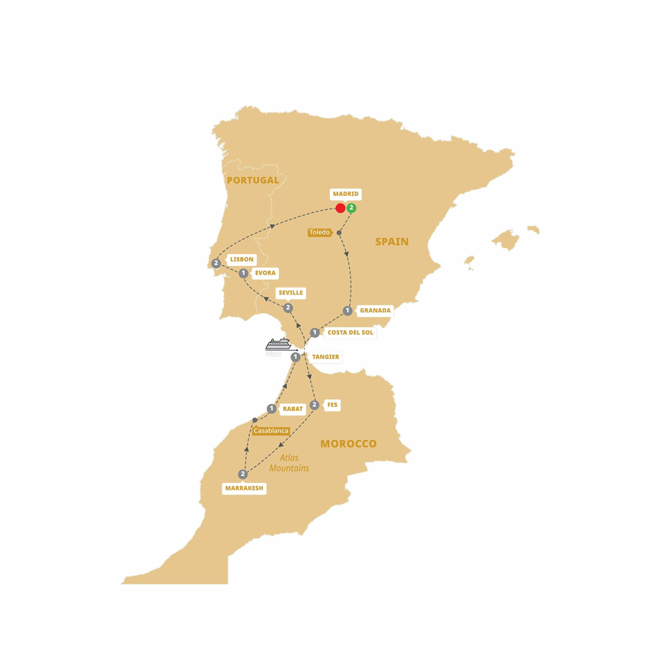 Highlights: Madrid, Toledo, Granada, Costa del Sol, Fes, Marrakesh, Casablanca, Rabat, Tangier, Seville, Panoias-Ourique, Évora, Lisbon, Madrid