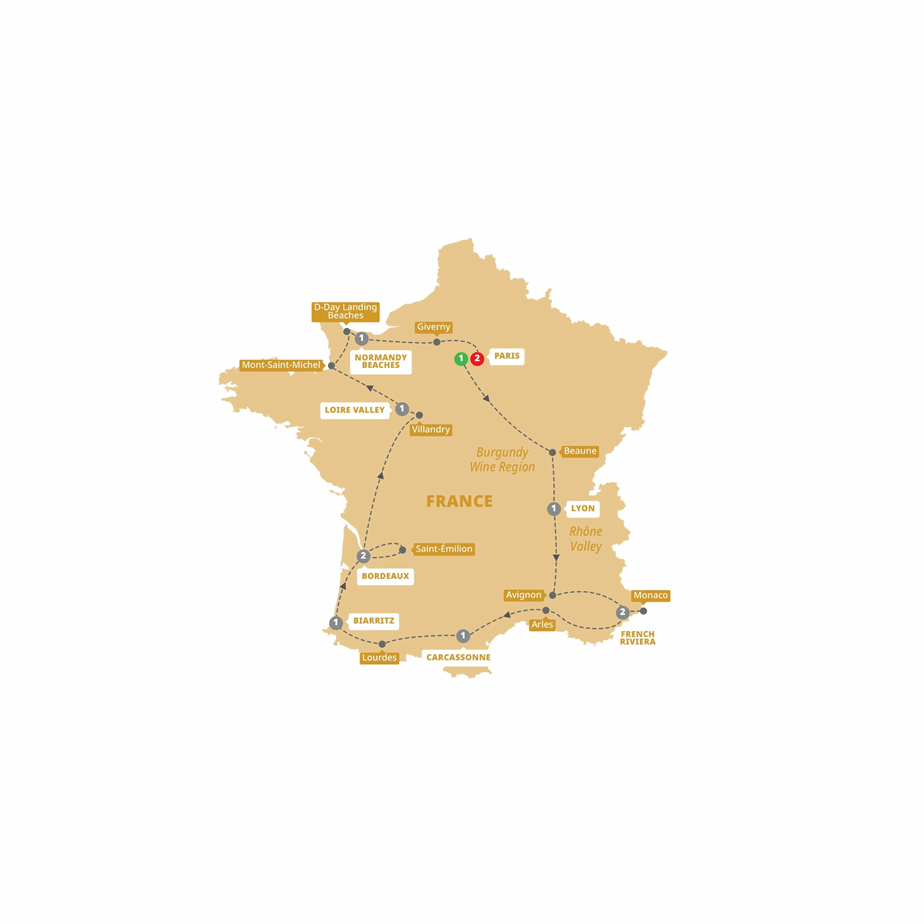 Highlights: Paris, Beaune, Lyon, Avignon, Monaco City, French Riviera, Arles, Carcassonne, Lourdes, Biarritz, Bordeaux, Saint-Émilion, Villandry, Loire Valley, Mont-Saint-Michel, Omaha Beach, Normandy Beaches, Giverny