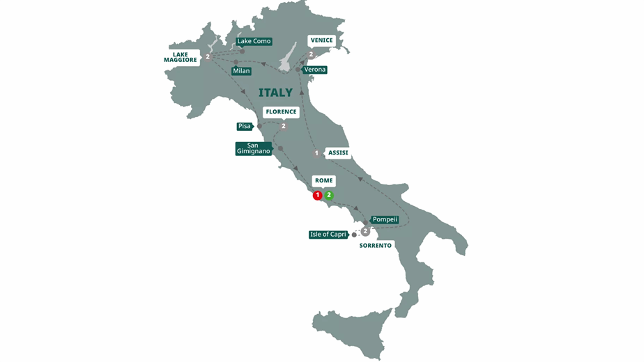 Highlights: Rome, Vatican City, Pompeii, Sorrento, Capri, Assisi, Verona, Venice, Milan, Lake Maggiore, Lake Como, Baveno, Pisa, Florence, San Gimignano, Rome
