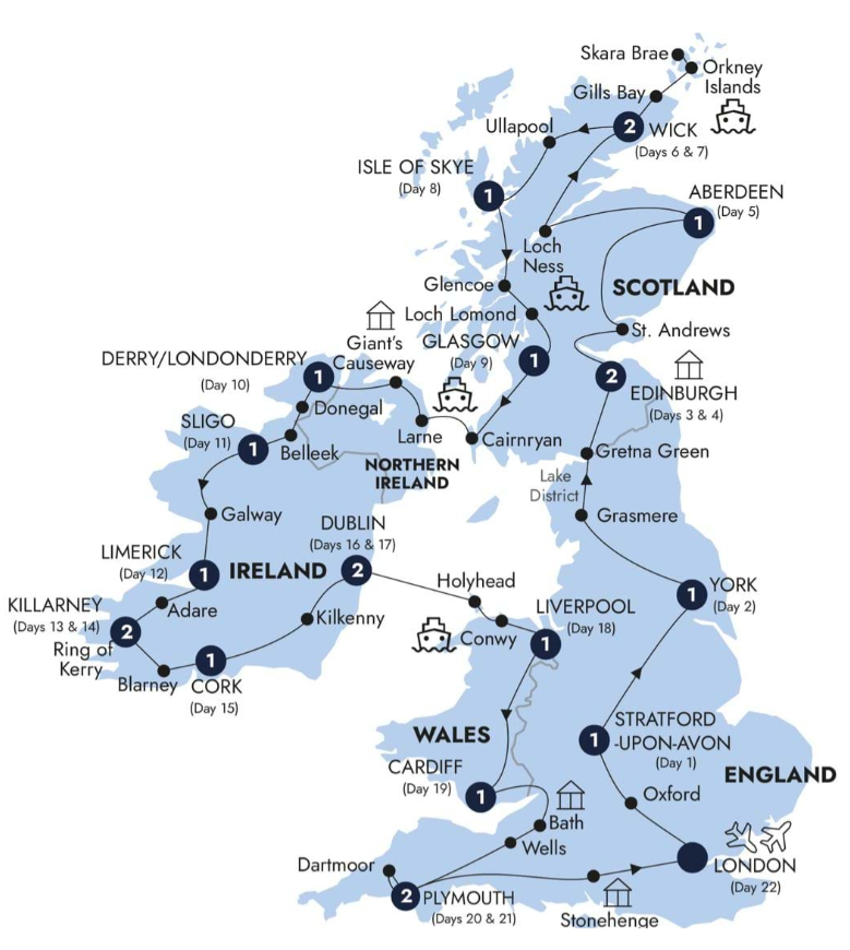 Highlights: London, Oxford, Cotswolds, Stratford-upon-Avon, York, Lake District, Grasmere, Gretna Green, Edinburgh, Aberdeen, Loch Ness, Wick, Orkney Islands, Ullapool, Skye, Eilean Donan, Fort William, Glencoe, Glasgow, Londonderry, belleek, Sligo Bay, Connemara, Galway, Limerick, Adare, Killarney, Ring of Kerry, Blarney Castle, Cork, Kilkenny, Dublin, Conwy, Liverpool, Cardiff, Bath, Wells, Plymouth, Dartmoor, Stonehenge