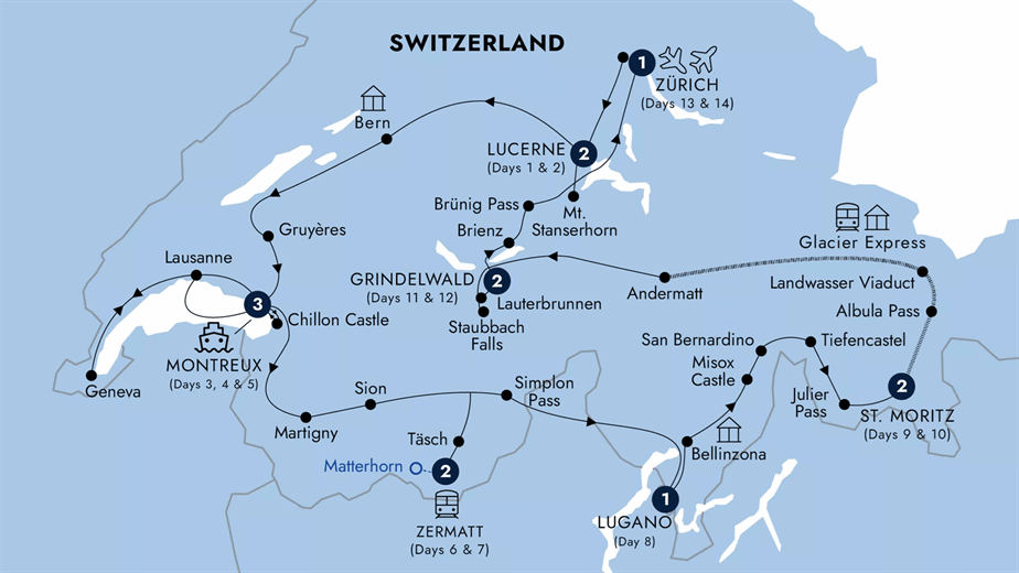 Highlights: Zürich, Lucerne, Stanserhorn, Bern, Gruyères, Montreux, Chillon Castle, Geneva, Martigny, Sion, Zermatt, Tasch, Stresa, Lugano, Bellinzona, Saint Moritz, Andermatt, Lauterbrunnen, Stabbach Falls, Grindelwald, Brienz, Zürich
