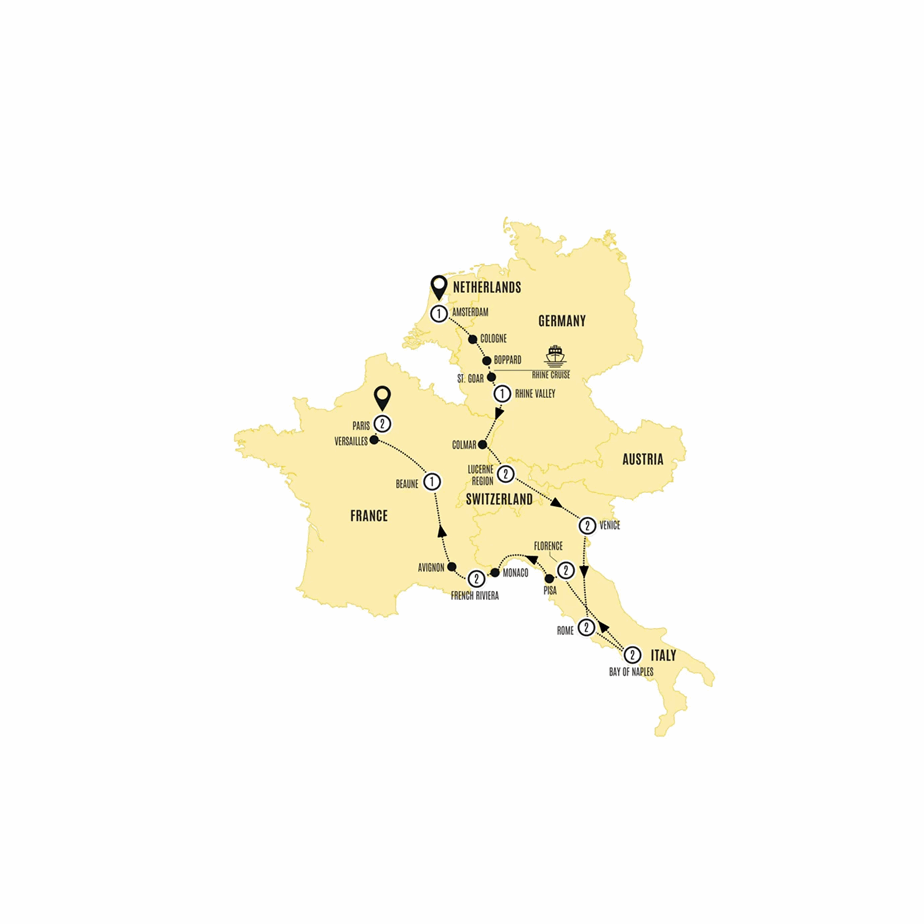 Highlights: Amsterdam, Cologne, Rhine Valley, Colmar, Lucerne Region, Venice, Rome, Bay of Naples, Florence, Pisa, Monaco, French Riviera, Avignon, Beaune, Versailles, Paris