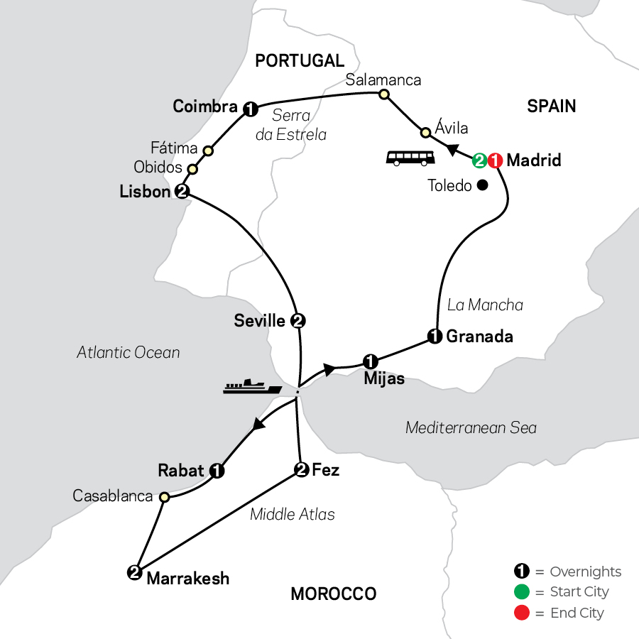 See Seville’s impressive Plaza d’España Take a scenic ferry across the Strait of Gibraltar Explore the markets of magical Marrakesh Tour Granada’s opulent Alhambra Palace