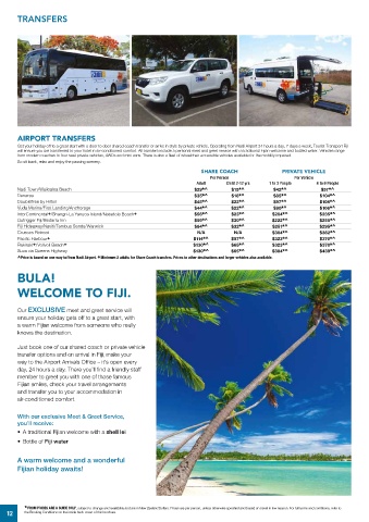^ Price is based on one way to/from Nadi Airport. + Minimum 2 adults for Share Coach transfers. Prices to other destinations and larger vehicles also available.
