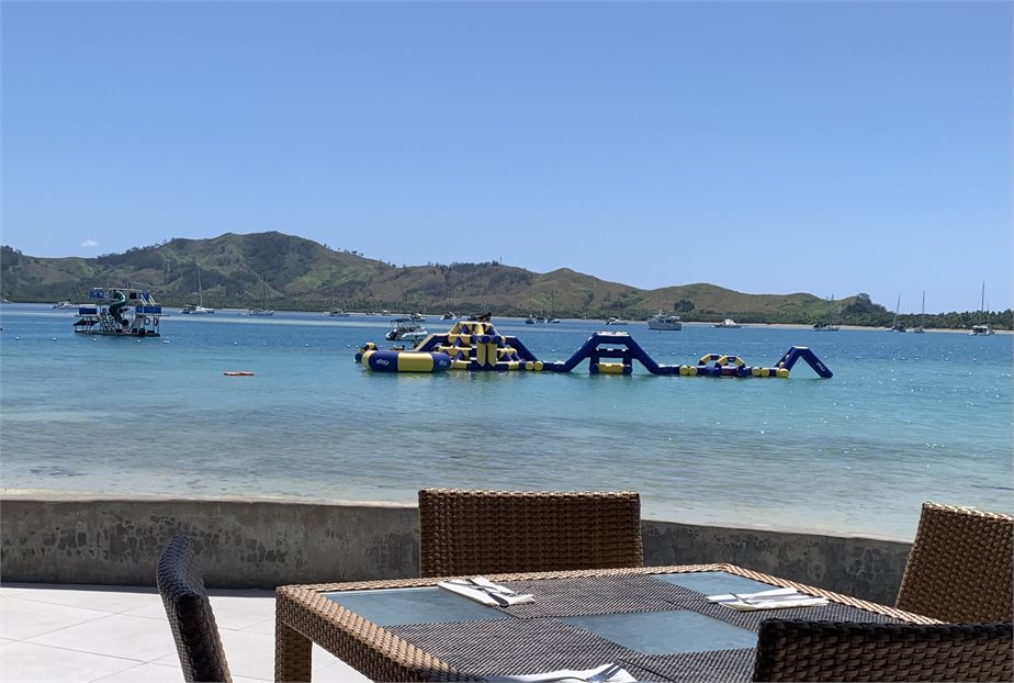 Plantation Island Inflatable waterpark. Sit and finish your meal while you watch the kids.